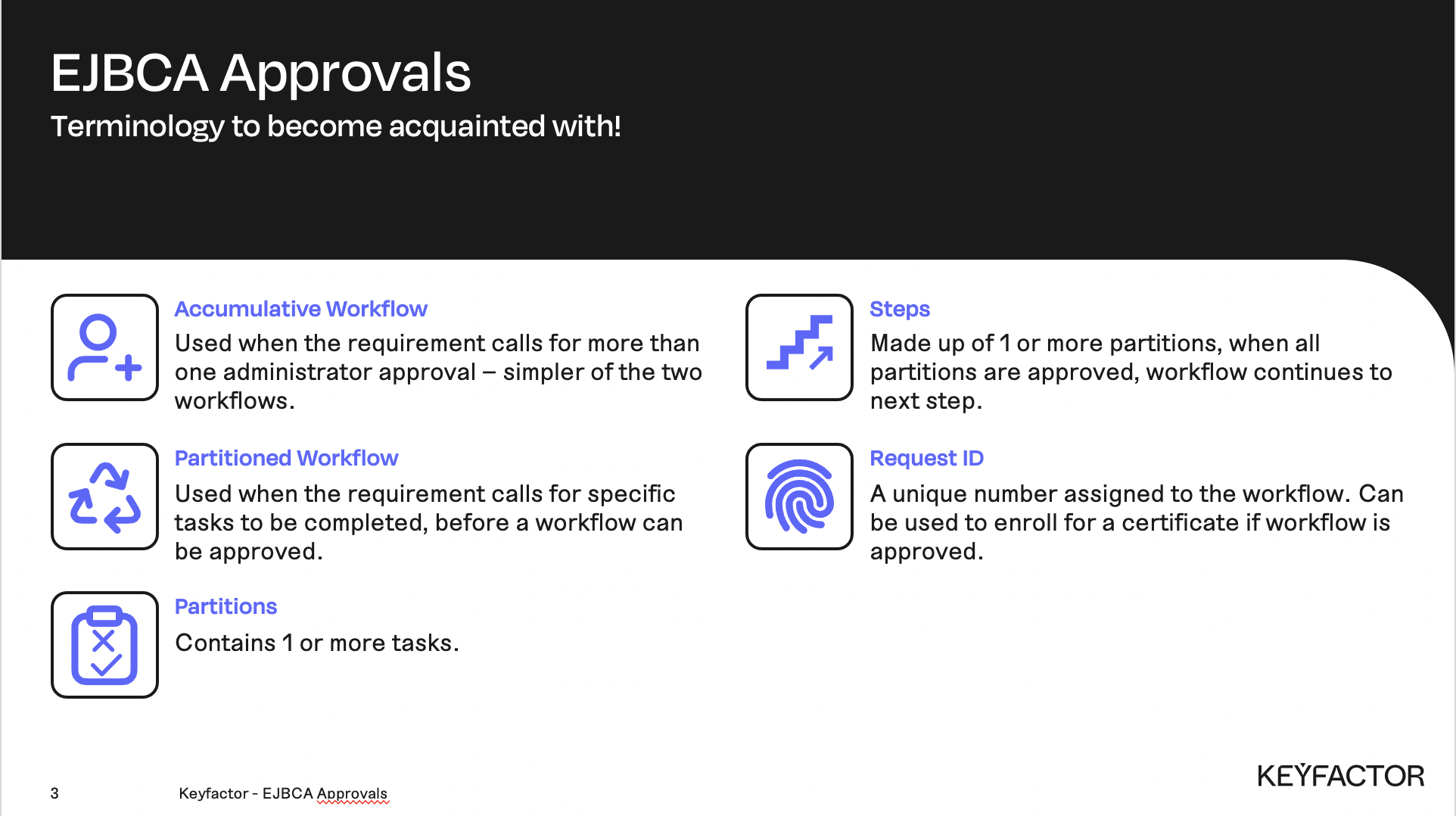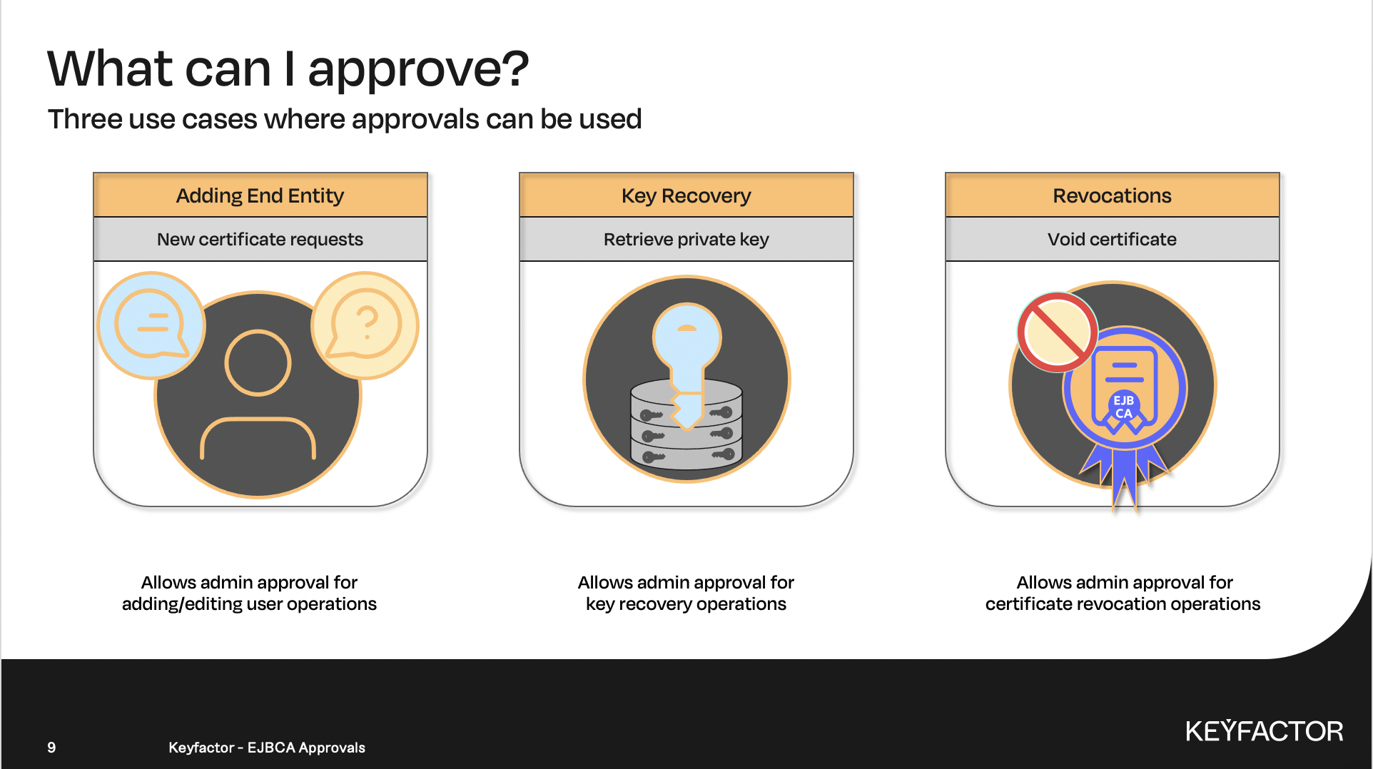 Overview: Sometimes your organization would like to divide the PKI responsibilities up among different folks, so no one person is in charge. This is the perfect opportunity to implement “approval workflows”. Within EJBCA there is a feature that allows the organization to divide responsibilities among different administrators when performing certain certificate tasks. This limits the power any one person may be assigned. And allows multiple people the ability to "sign off" on a certificate operation.