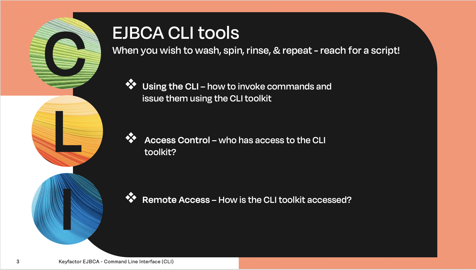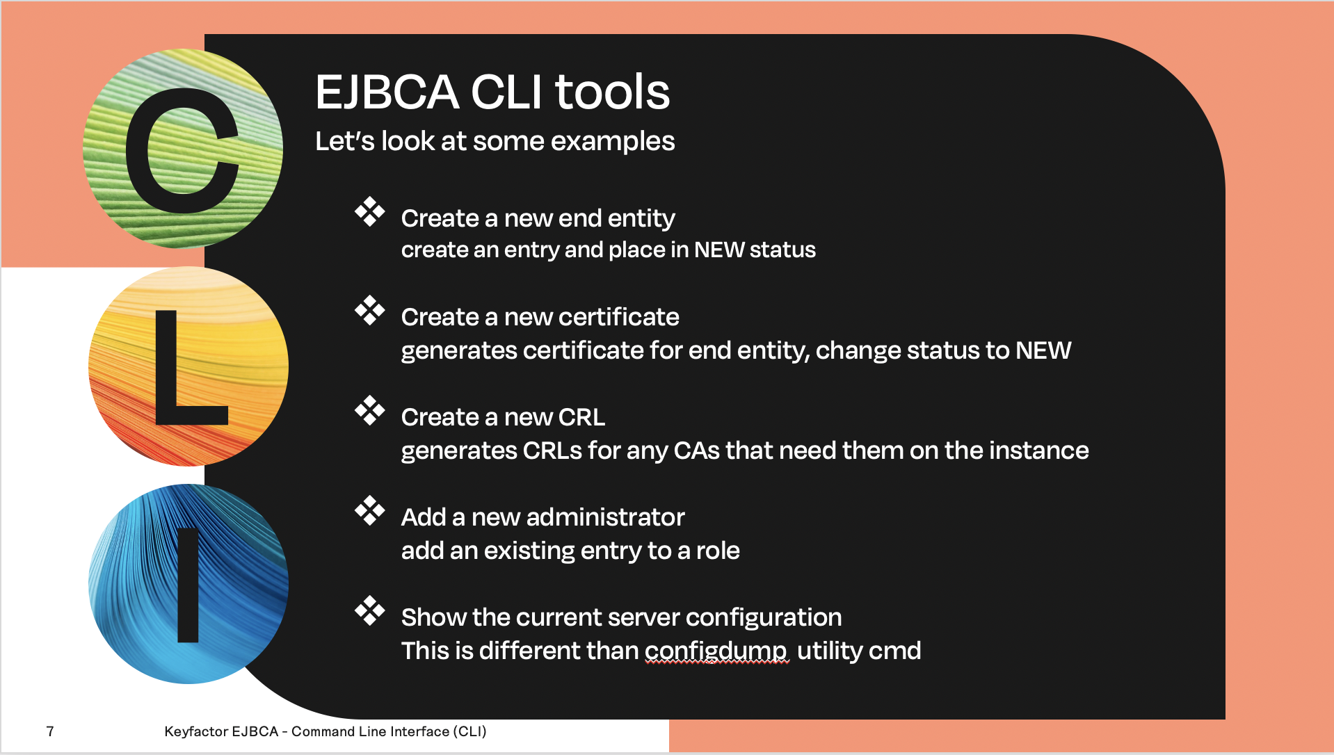 /opt/ejbca/bin (EJBCA CLI) - contains the second toolkit, that can be used to interface with EJBCA using a terminal session. You may also use the commands interactively, or if you like, create a script to run repetitive tasks. Some tasks that can be performed with the CLI include: