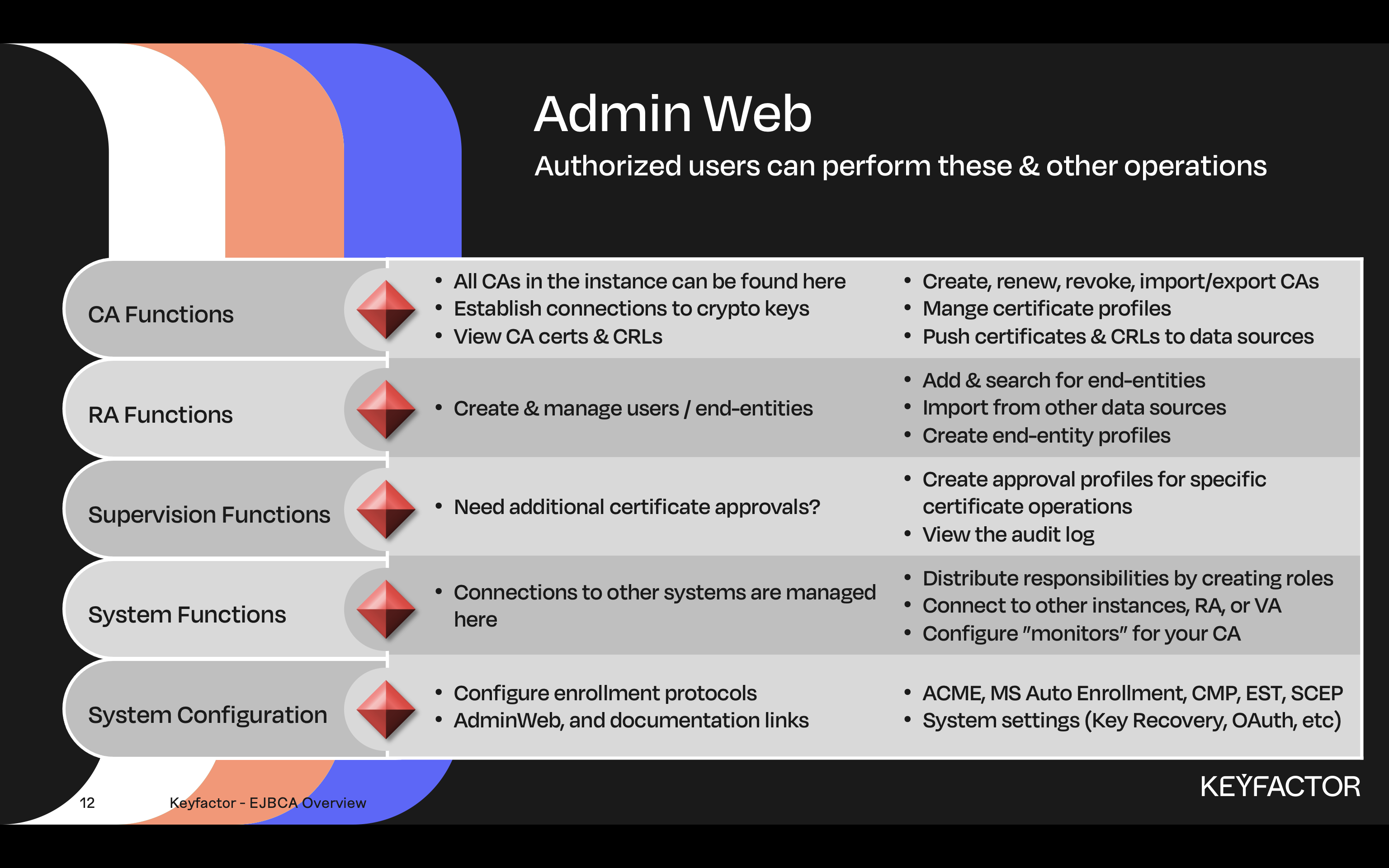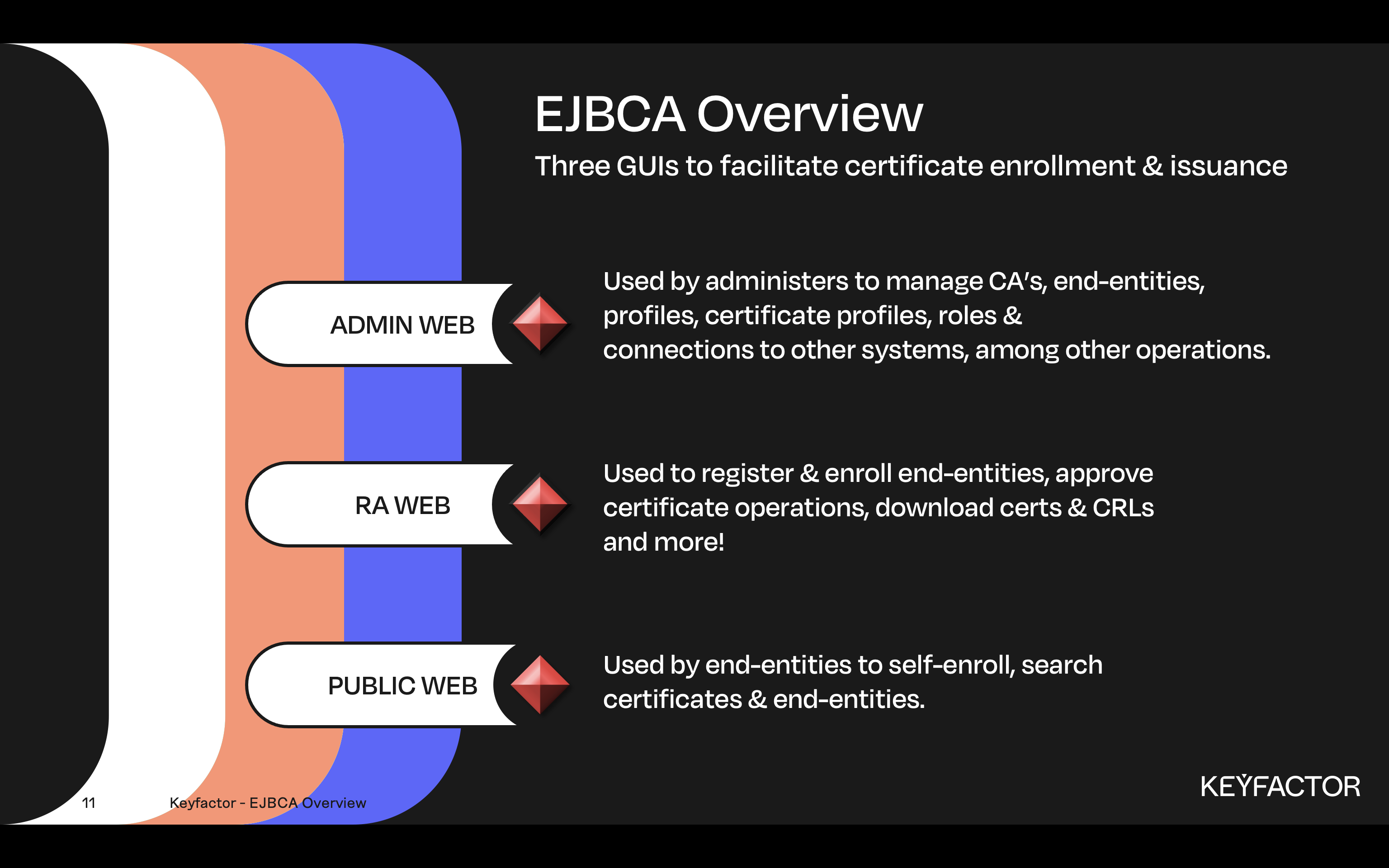 EJBCA has 3 interfaces, each of which is described below. The information below is provided to help gain an understanding of the functionality available in each interface. If you are familiar with EJBCA, you may have used Public Web in the past. The functionality of Public Web has now been folded into RAWeb, and is no longer available in EJBCA releases > version 8.0.