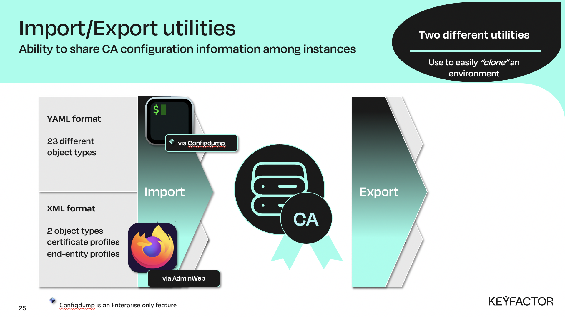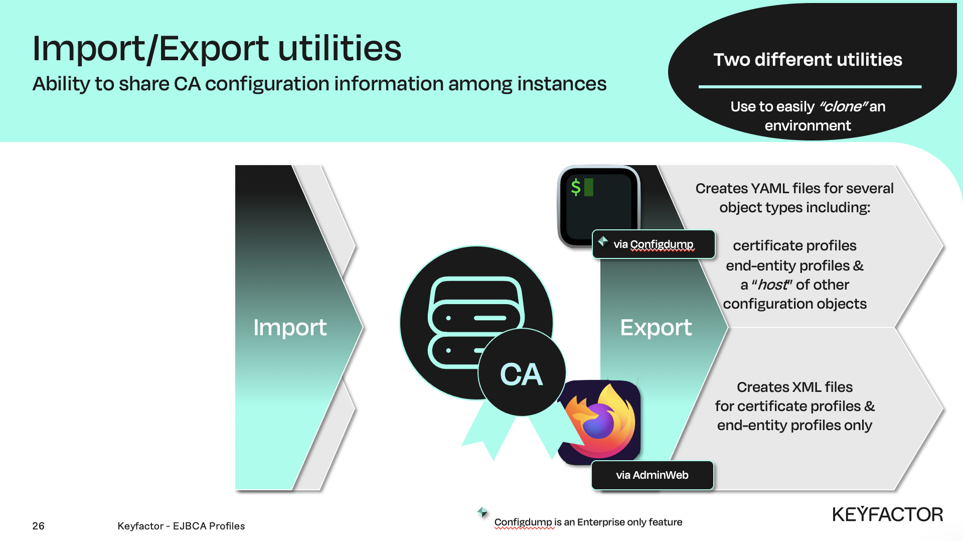 EXPORT options can be used for certificate and end-entity profiles via Admin Web, or CMD line