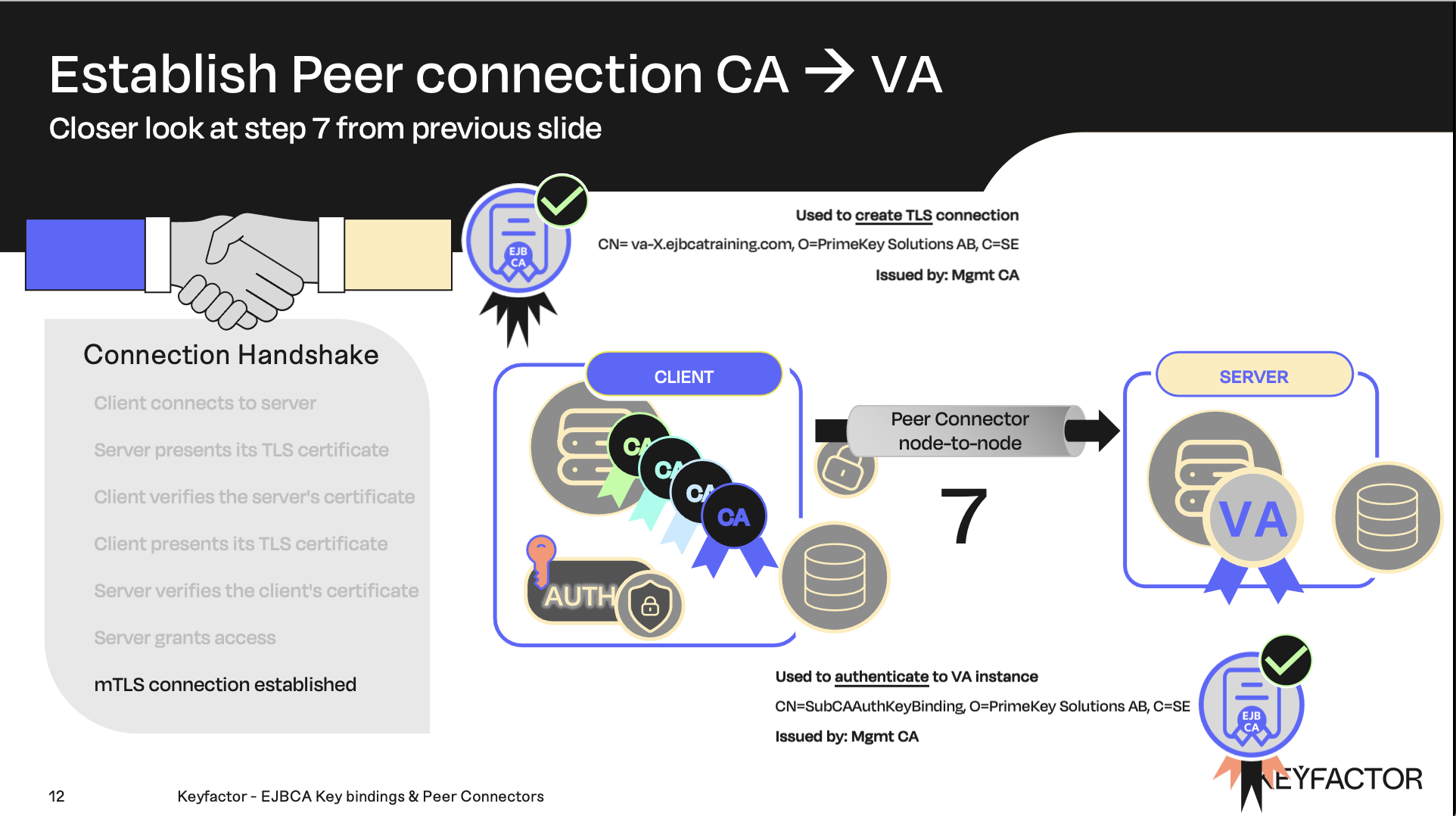The EJBCA "server instance" (our VA instance) will authenticate to our CA instance. This creates the mutually authenticated mTLS connection. Once this connection is established, any information flowing between the two will be encrypted as well.