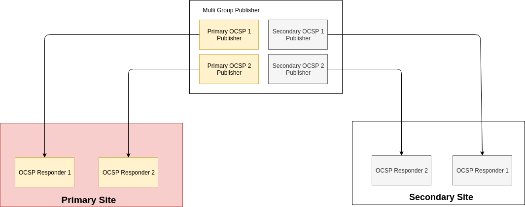 To achieve this we can create a multi-group publisher with two groups. Group 1 would consist of the two OCSP responders in the primary site, and group 2 would consist of the two OCSP responders in the secondary site. In the CA configuration, only the multi group publisher need to be selected.