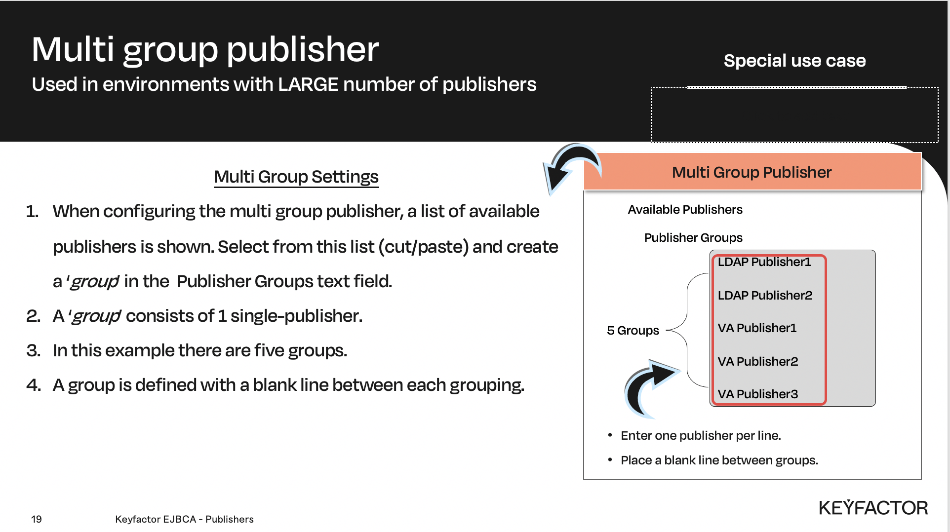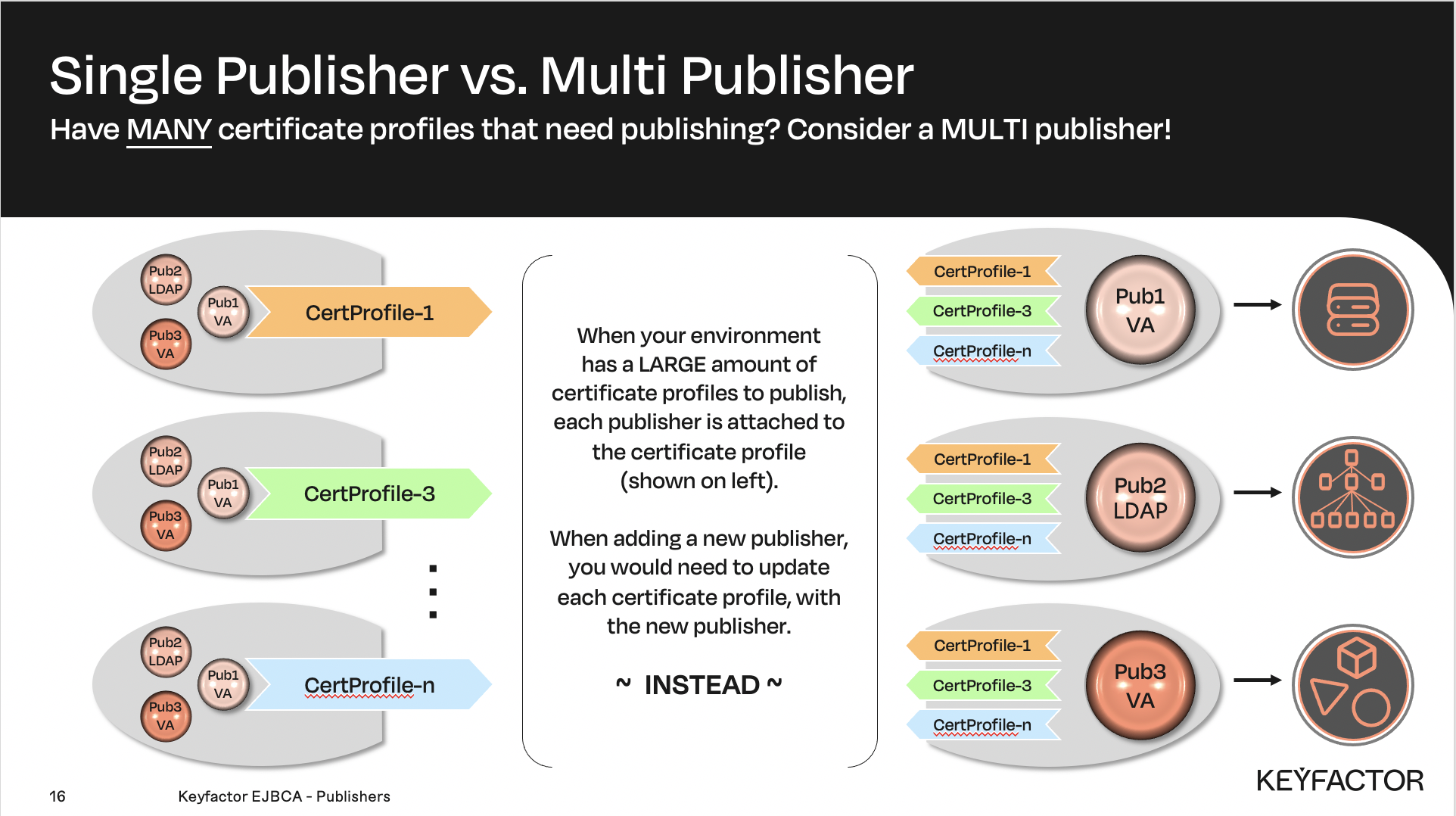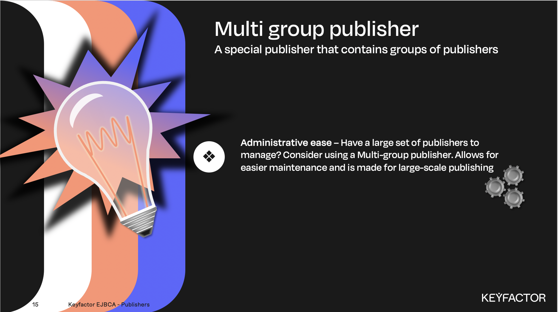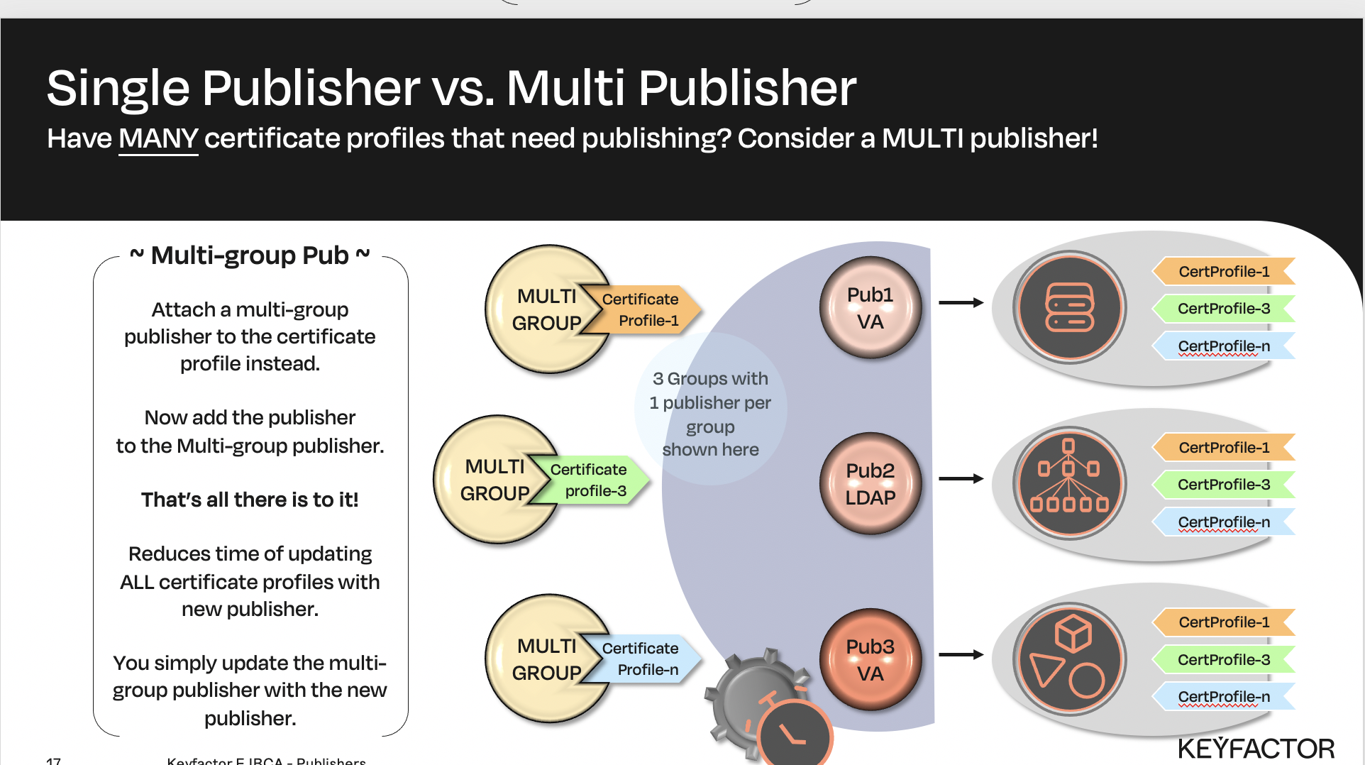 Simplify administration - The multi group publisher provides a single point of configuration for your publisher settings. Instead of enabling and disabling publishers for each individual certificate profile, you just need to add the publisher in one place, that is add it to the multi group publisher, and add the multi-group publisher to the desired certificate profile(s).