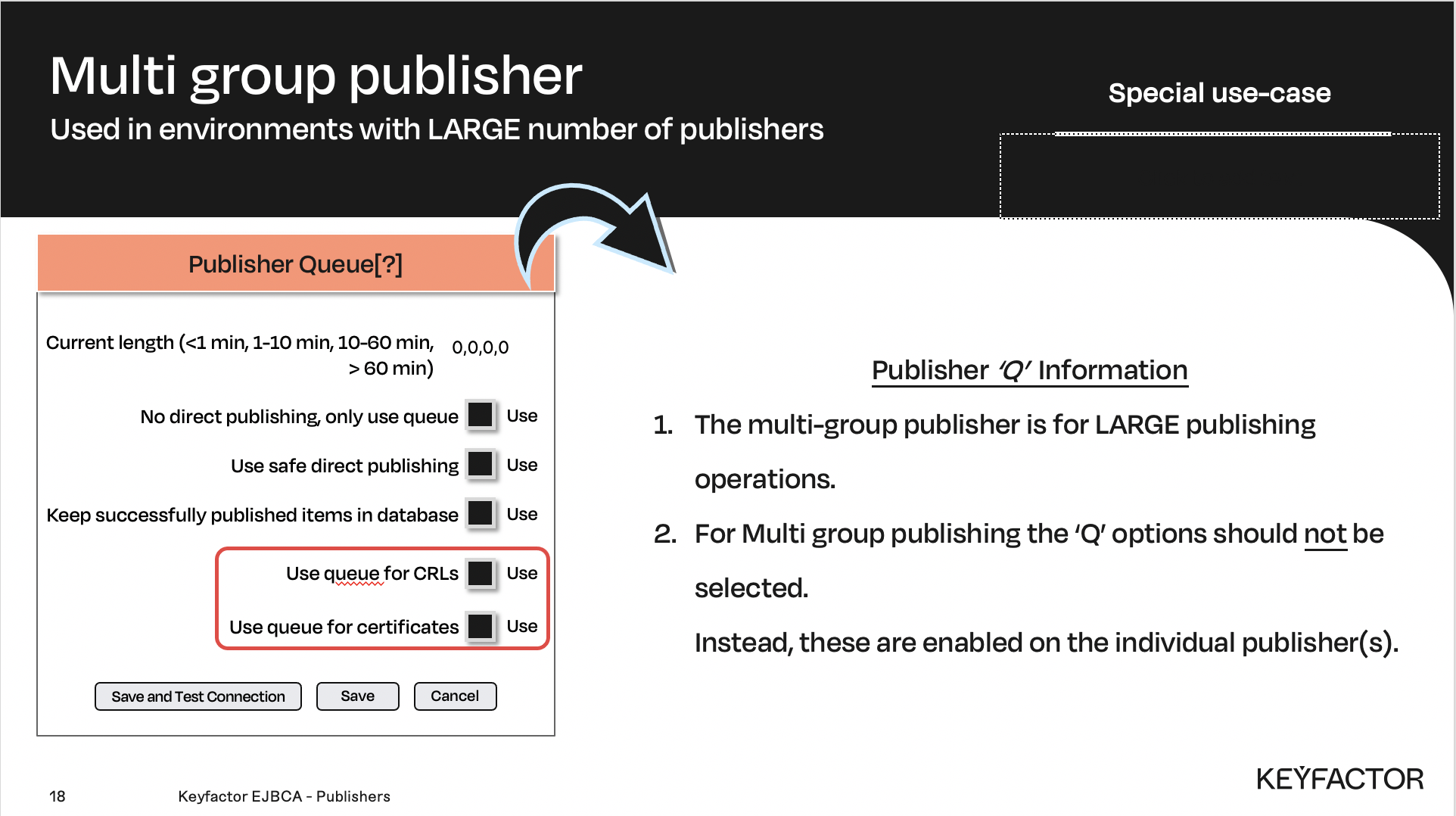 Using the database queue to store CRLs and certificates to be published is a good idea in general, but should be disabled for the multi group publisher. Instead the queue should be enabled for each publisher in the publisher groups.