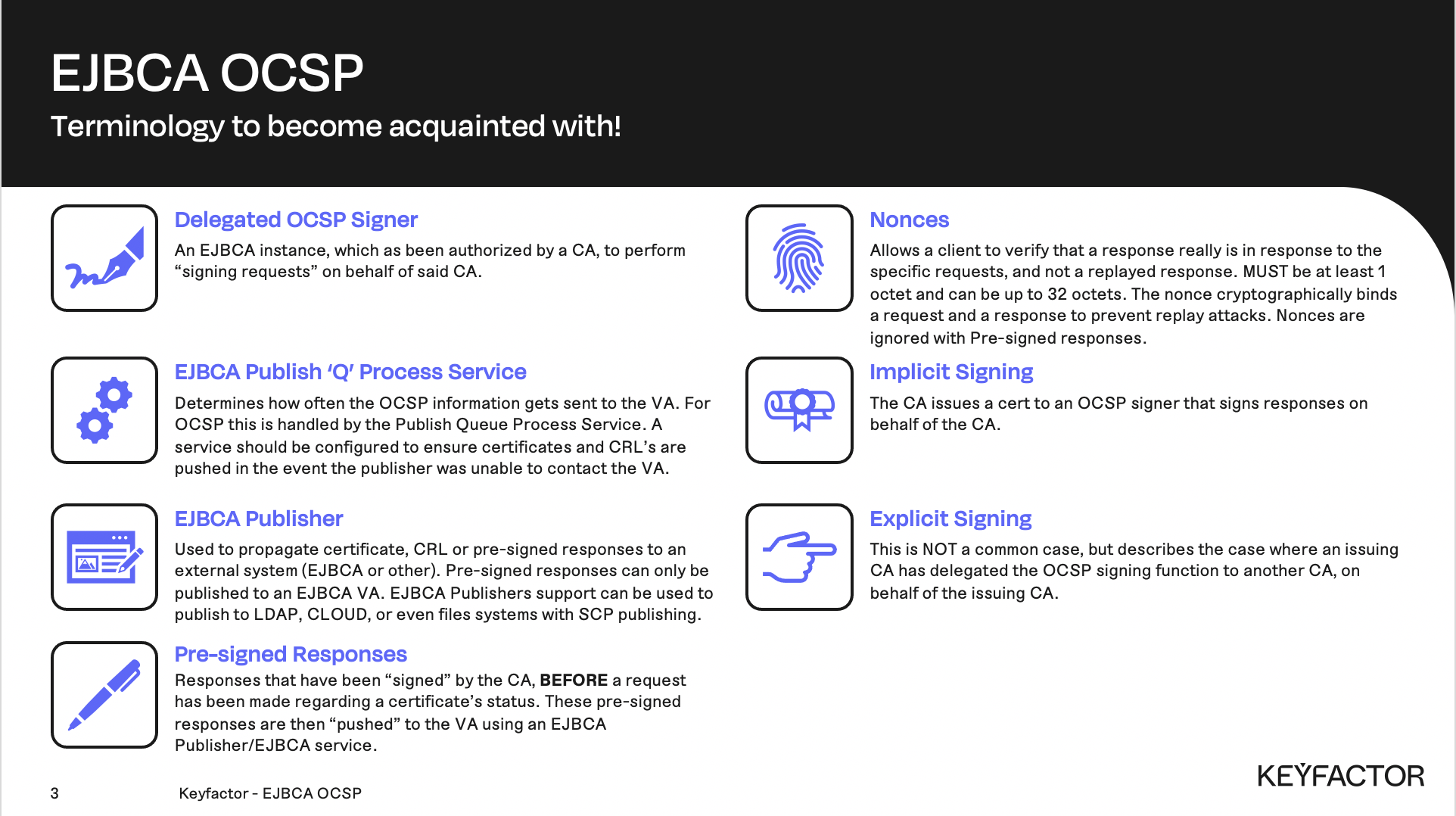 Overview: In this lab the VA instance we created in an earlier module will be now be configured as an OCSP responder. There are multiple ways to configure your VA to service certificate status requests. In this lab we will be using the VA to host dedicated OCSP signing keys.