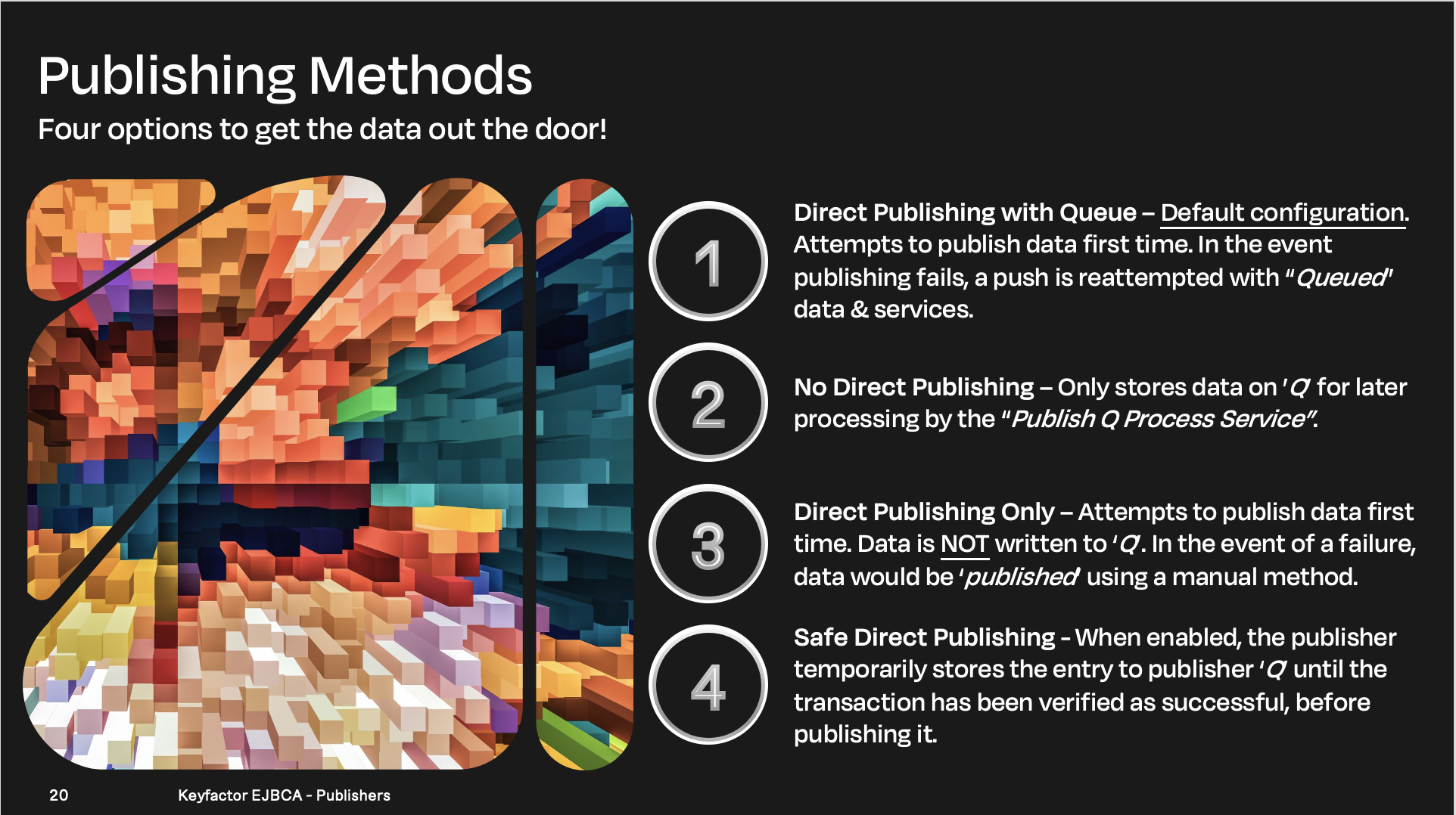 There are also different "methods" for publishing certificates (Direct Publishing w/ queue, No direct publishing, Direct publishing only, & Safe Direct publishing). The method you choose depends on your requirements.