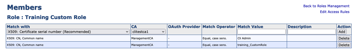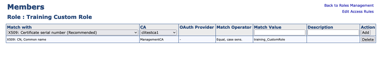 docker exec -it ejbca-CA ./bin/ejbca.sh roles addrolemember --role "Training Custom Role" --caname "ManagementCA" \